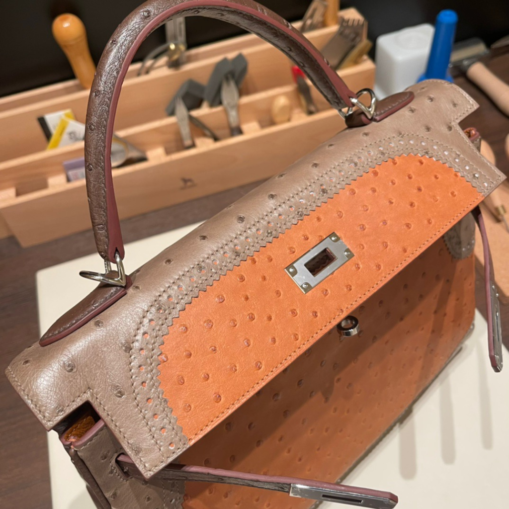 今回紹介するケリー 32cmの最大の特徴は、「オーストリッチ皮」という希少素材に、3種類の調和の取れた高級カラーを組み合わせた点にあります。それぞれの要素がエルメスの最高級クラフトを体现しているため、一つずつ詳しく解説します。